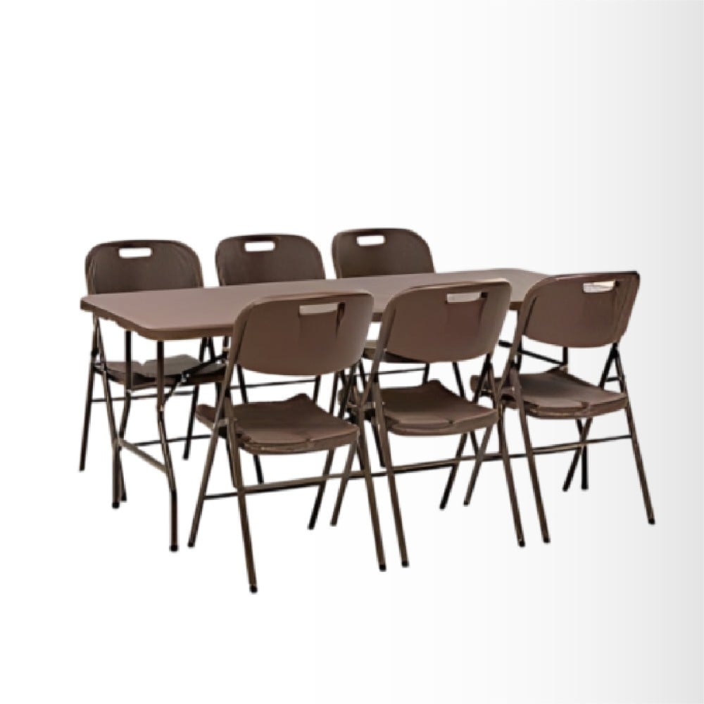 مجموعة مكونة من 7 قطع قابلة للطي مكونة من طاولة قابلة للطي 152*70*74 سم بنية اللون و 6 كراسي قابلة للطي بنية اللون.